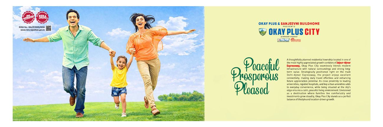 Located on the Delhi–Ajmer Expressway (NH-48), Jaipur, Okay Plus City is a thoughtfully planned, fully gated township designed for modern families and smart investors. Developed by Okay Plus Group and Sanjeevni Buildhome, the project offers a secure and well-connected address in one of Jaipur’s fastest-growing corridors. With a grand entry gate and 24x7 security, it creates a safe and organized living environment that blends convenience with long-term value. The township is enriched with lifestyle amenities including landscaped parks, a temple, open gym, kids play area, and a dedicated meditation zone, making it ideal for balanced community living. Currently available at a pre-launch price of ?30,000 per square yard for a limited time, it presents a strong opportunity to invest early in a high-potential location before prices rise.